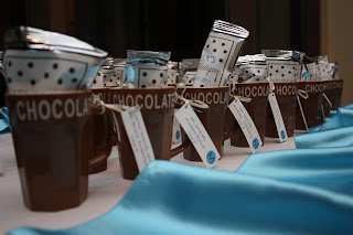 Event Savvy created a personalized logo, M, featured as decor throughout the party venue and found on the tags of the table place cards, hung on hot chocolate mugs that contained hot chocolate packets. Celebrants immediately enjoyed the chocolate theme. How yummy!